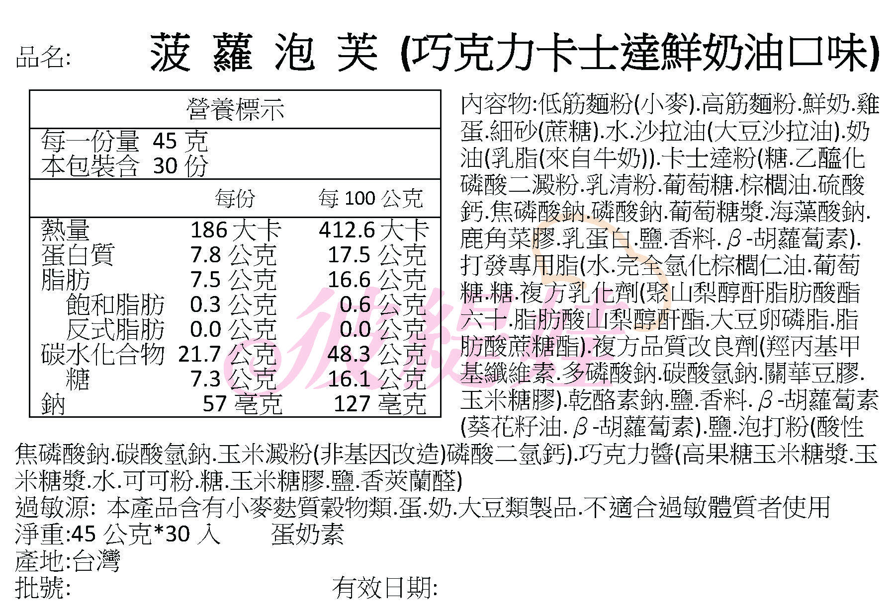 目前位置:首頁 / 美味專區 / 【菠蘿泡芙】菠蘿泡芙(巧克力卡士達口味) ‹ › ‹ › 【菠蘿泡芙】菠蘿泡芙(巧克力卡士達口味) 商品類型: 菠蘿泡芙 商品單價: 990元 商品規格: 50g/入;30入/盒(2單位箱裝) 商品說明: 酥脆的菠蘿外皮,裹著飽滿香醇的內餡,一口咬下,瞬間征服你的味蕾!由鮮奶及奶油熬煮而成的牛奶卡士達,再加入巧克力醬混合而成的巧克力卡士達醬,甜甜似愛情的滋味~ 主要成份: 奶油、沙拉油、牛奶、麵粉、雞蛋、鮮奶油、鹽、泡打粉、可可粉、巧克力醬 保存方式: 冷凍 保存期限: 25天 食用方式: 拆封即食 商品產地: 台灣 剩於數量: 訂單成立後進行製作 訂購數量: 請選擇 123456789101112131415161718192021222324252627282930313233343536373839404142434445464748495051525354555657585960616263646566676869707172737475767778798081828384858687888990919293949596979899100 分享 ✚商品特色 1盒/2單位箱裝 服務小叮嚀 訂購須知: 1. 以上報價金額為含稅價,物流費用另計.大宗商品交易,物流費用另計.此為季報價單.會依物料.成本浮動調整.本公司保有修改之權利 2.商品保存須知:冷凍-冷藏商品皆有有效期限,須盡到食品安全衛生管理法規定,酌量交貨-儘速接貨處理銷售及安全保存,不得過量存貨使用過期商品 3.下單方式: 網路訂購 / 電話訂購 / 官方Line訂購 下單後須完成滙款手續才算完成交易,請告知滙款後5碼 出貨可以個別單位下單,集合以12單位/1箱為基本(最低)出貨量;未滿12單位一箱出貨量者,物流費用以12單位一箱計算 商品保存期限與方式: 1.本公司低温產品皆需冷凍-18度C保存,不得解凍後再冷凍;如放置冷藏須於4日內食用完畢!!請妥善留意產品保存環境!! 蛋糕尺吋為參考值,因產品冷凍後會收縮10%屬正常現像,機器切割會因產品軟硬度而有些微誤差,請以實際收到尺吋為準. 2.商品不建議再次退凍會影響原味品質 售後服務: 1.本公司依消保法規定,生鮮食品不適用於消費者保護法第19條,並不享有7天鑑賞期 2.其它相關優惠專案或調整商品會於本站公告為準,不另行個別通知. 3.本公司保有商品裝飾修改權利.版權所有,請勿翻印. ✚商品注意事項 其他應揭露事項: 本產品含有雞蛋.牛奶 消費者收受之商品,其有效日期至少距收受日5日以上 賓寶食品企業有限公司監製 代表人:洪佳寶 營業所:台南市佳里區營業所 電話:06-7236328 電子郵件:beautifulbaby1019@gmail.com 食品業者登錄字號: D-128584510-00006-0 投保產品責任險:本產品已投保富邦產物產品責任險 原產地:台灣 產品銷售數量100份,售完為止 本購物車僅限線上刷卡/ATM轉帳功能 價格不含運費,低溫運費290元/件 運送方式為冷凍配送 退換貨須知: 消費者取貨時,應從速檢查所受領之物;欲退換貨,應善盡商品保存之責任 若對於購買流程、付款方式、退貨及商品運送方式有疑問,可洽詢客服專線:06-7236328 消費爭議處理申訴(客服專線): 電話: 06-7236328 食安專線:1919 業者資訊消費爭議之處理:訴訟管轄為台南地方第一法院 回商品列表